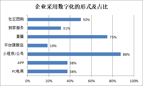 目前,百貨零售企業采用的數字化服務方式主要有:PC電商、APP、小程序/公號商場、平臺旗艦店、直播、到家服務、社區團購等。調查數據顯示,目前大部分企業都采用的有小程序、直播,占比分別達到88%和75%,直播方式今年以來使用普及速度很快;社區團購使用占比達到50%;平臺旗艦店方式使用占比最低,約20%,這主要是百貨零售企業希望自己擁有相對獨立的數字化平臺,PC電商、APP方式使用相對較多,分別達到38%。具體數據請見圖三。
