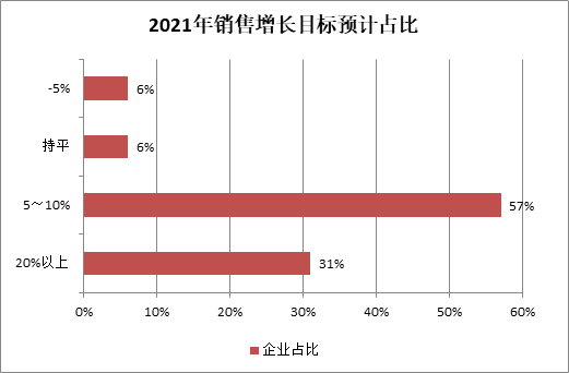 1、絕大部分企業對2021年業績增長持有信心。將近90%的企業認為,明年銷售收入將比2020年好。其中,認為銷售增速超過20%的企業占比31%,大部分認為合理增幅在5~10%之間。少數企業比較謹慎,認為2021年將持平,或略有下降,占比為12%。