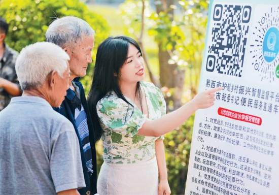 近年來,各地探索運用數字技術創新監督手段,提升監督的針對性和效果。圖為2024年9月14日,貴州省黔西市紀檢監察干部在錦繡街道錦繡社區指導群眾利用微信小程序等進行舉報監督。 人民圖片 周訓超/攝
